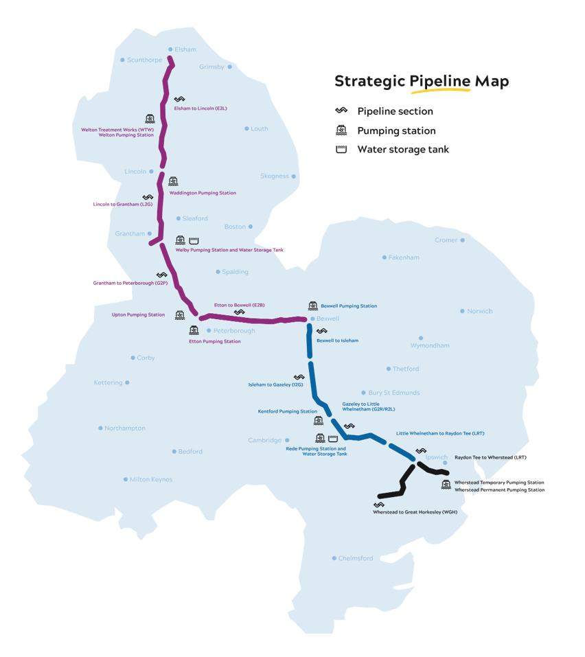 Once complete, hundreds of kilometres of underground, large-diameter, interconnecting pipelines will stretch from North Lincolnshire to Essex. They'll be supported by new infrastructure such as pumping stations and storage reservoirs along the route to bring water to customer’s taps.