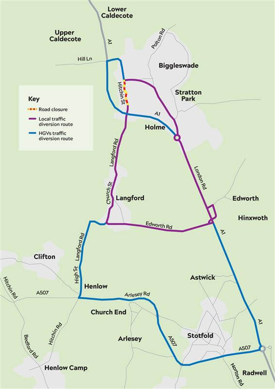 When road closures are in place this diversion route must be followed. HGVs must use the blue route shown on the map for the whole duration of the project.
