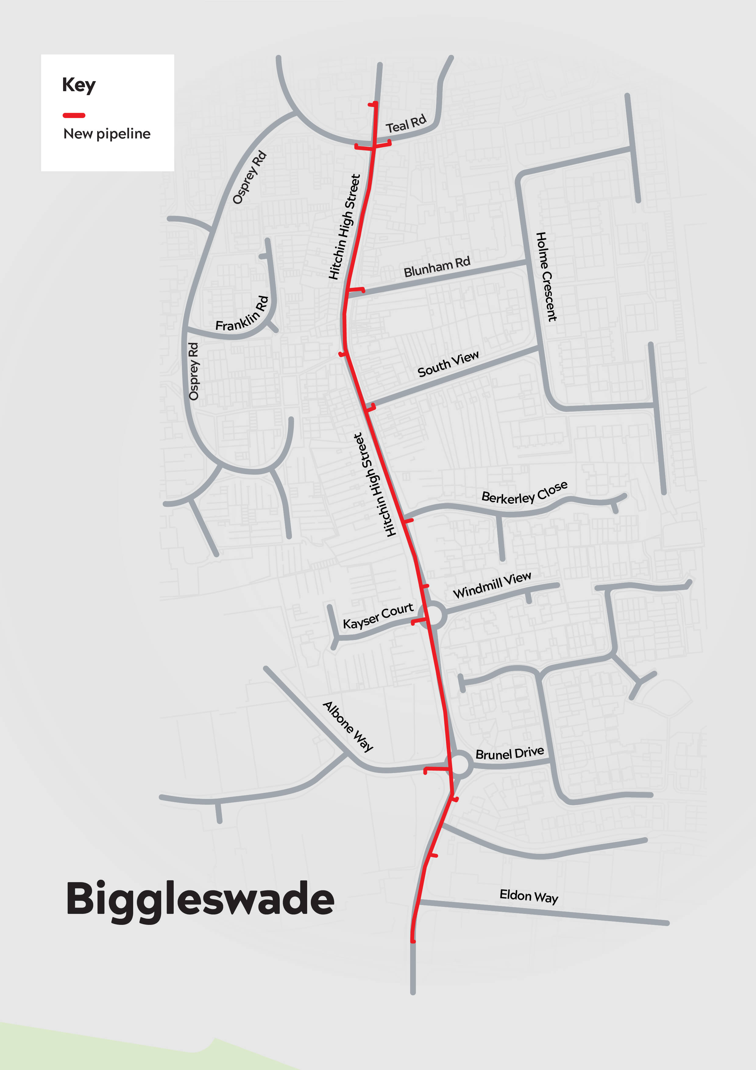 Our new pipes will be installed underground on Hitchin Street, click here to see a map. The pipeline will start from the southern entrance near Langford Road and will carry on down Hitchin Street to the Saffron Road /Teal Road junction.