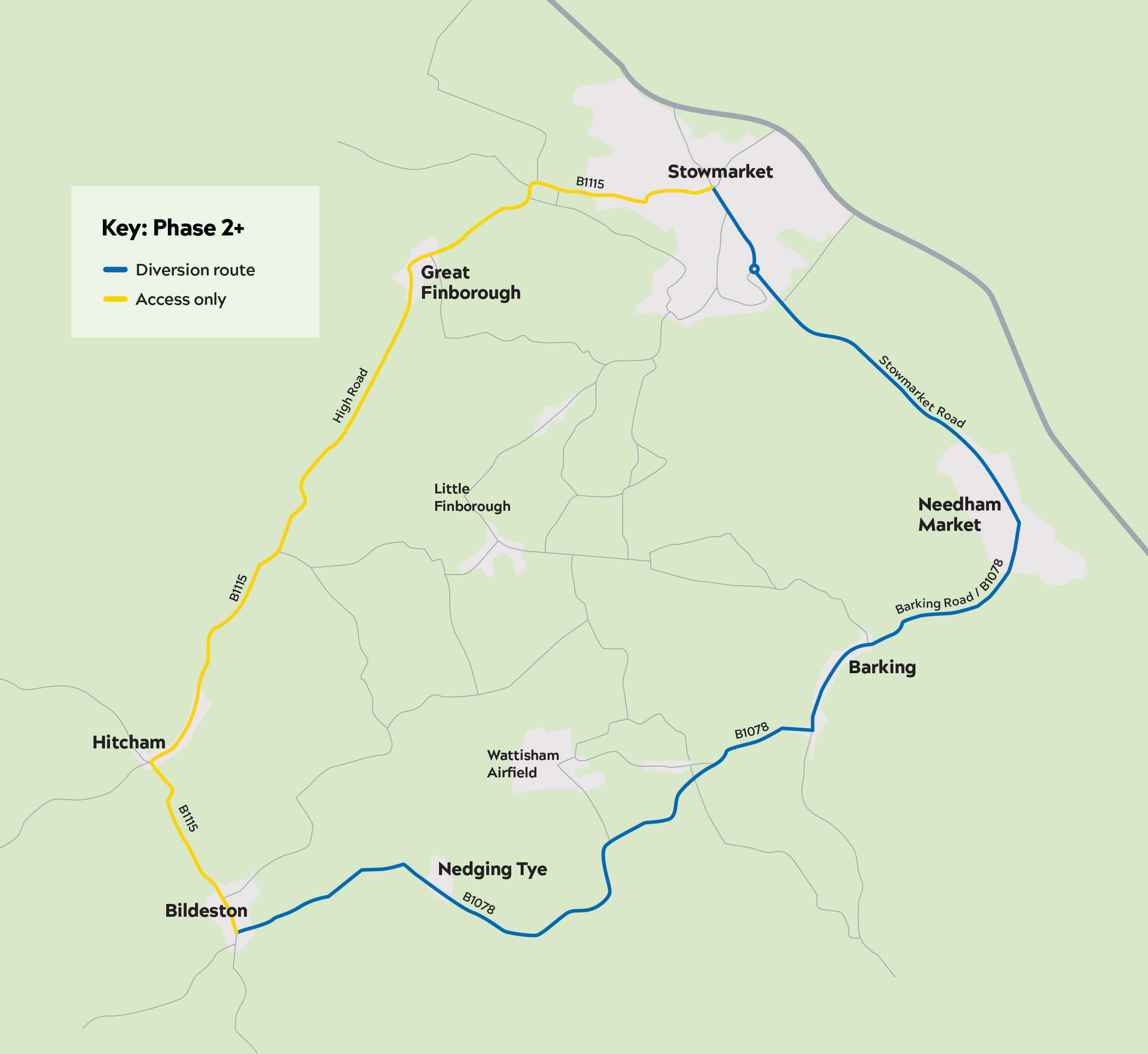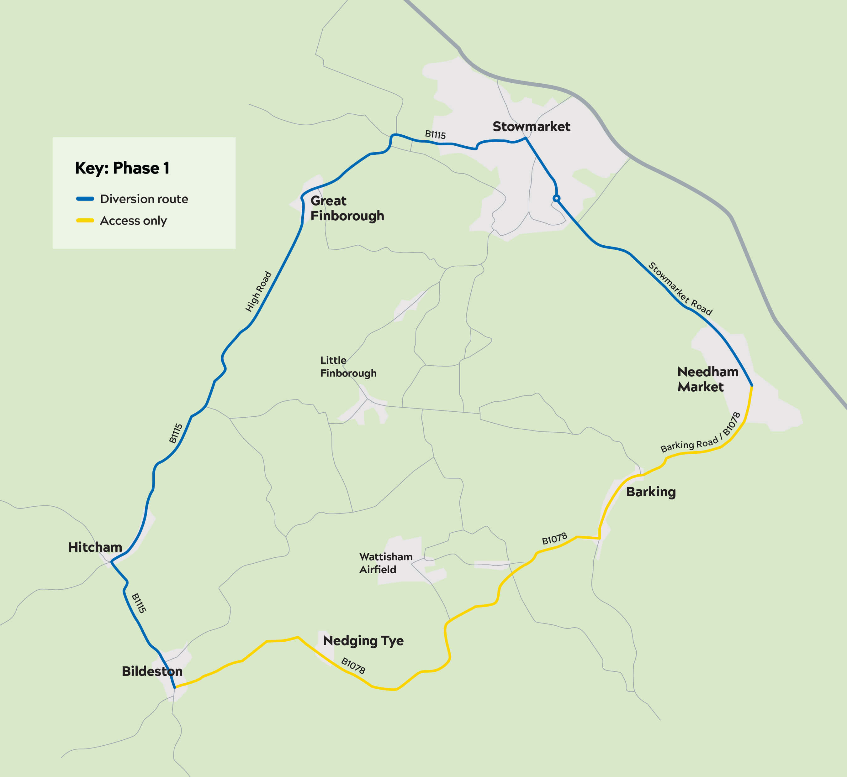 When road closures are in place a signposted diversion route will be in place via Hitcham, Cross Green, Stowmarket and Needham Market.